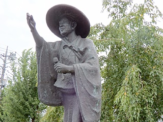 市制50周年を記念して平成20年におせん公園に建てられました。河合曾良は奥の細道の旅に随行した芭蕉の門人です。曾良像は交差点の反対側にあります。