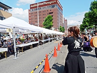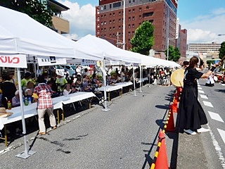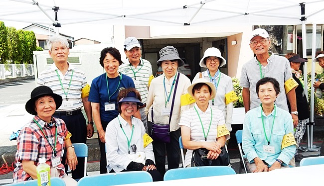 7月21日(金)、老人保健施設の参観支援として、午後1:00より歩行者天国となった国道17号線の「マロウドイン熊谷」前の上り車線に10個のテントを張詰め・机や椅子を並べお客様のお出迎えを行い楽しんで頂きました。と・同時に私達ボランティアの仲間達も(10名)特等席で満足々・・