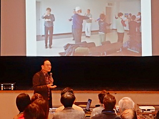 紹介内容は、パワーポイントで傾聴ボランティア養成講座の活動状況、そして傾聴ボランティアに関する講演、最後に養成講座の会員とともに「みんなで踊ろう」を実施した。