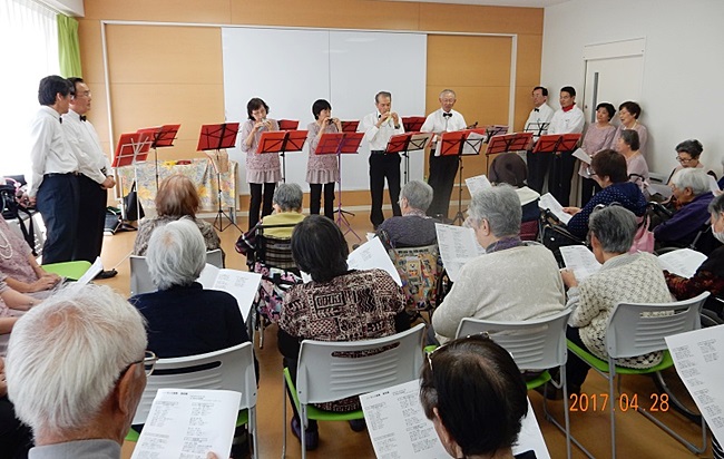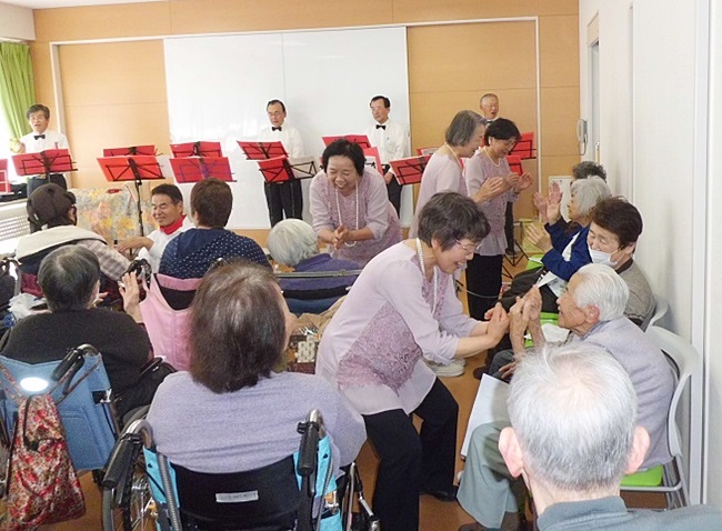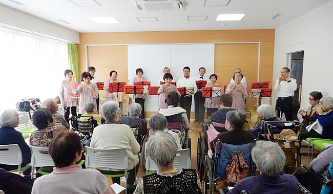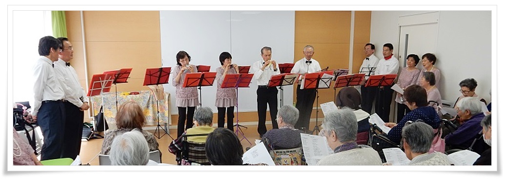 頑張って10数曲の練習をしてきましたが、見渡せばお元気な皆さんばかりで、オープニングの「思い出」からドキドキの緊張でしたが、施設利用者の皆さんの暖かい大きな拍手で、気持ちも和らぎ、演奏のスタートができました。