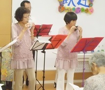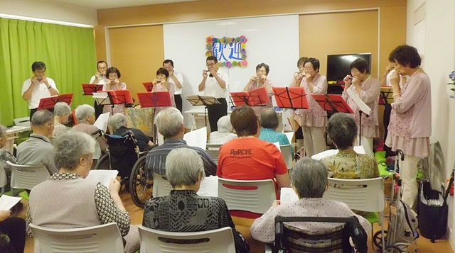 ラストソングは「ふるさと」を演奏し、大合唱していただき楽しい時間を共有出来ました。演奏後、皆様と握手したり、お話ししたりと、交流を深めました。いつも声が出ないおばあちゃんが「ハーモニカ演奏に合わせて歌えるようになって嬉しいです!」とお話ししてくれました。