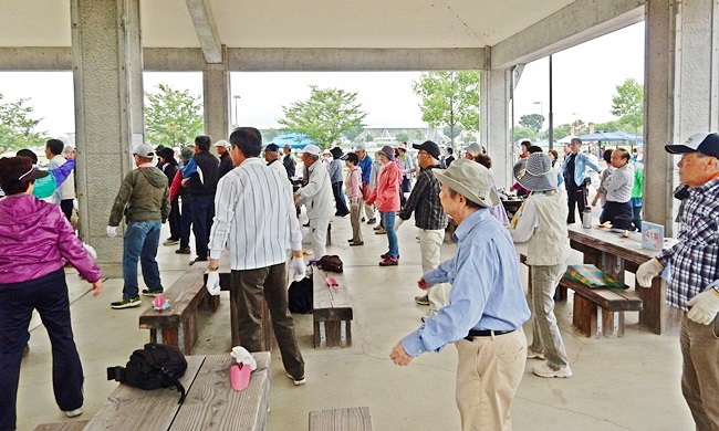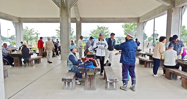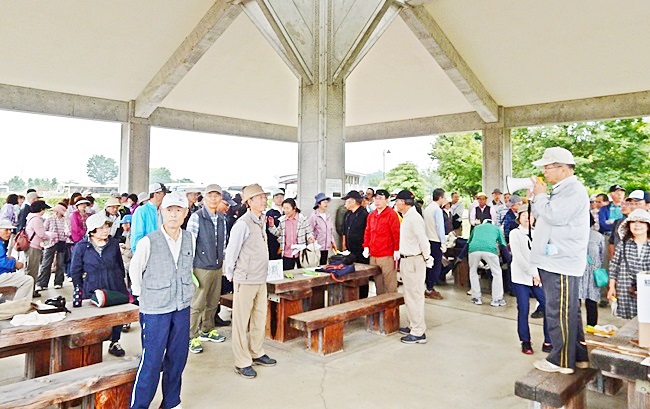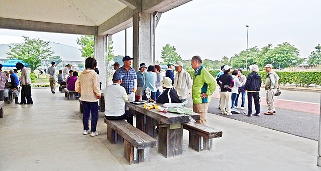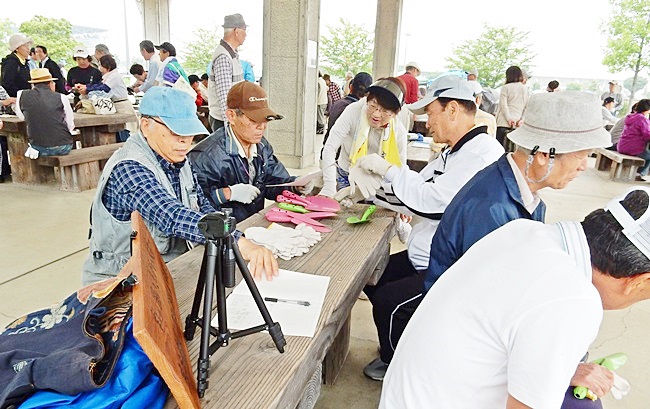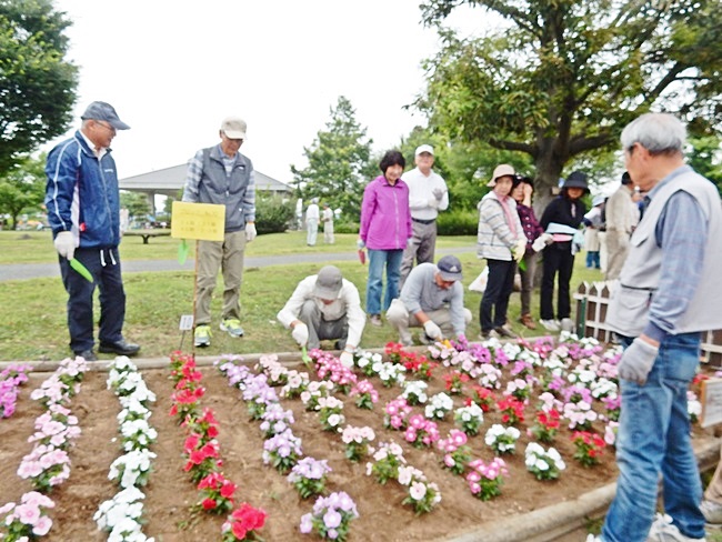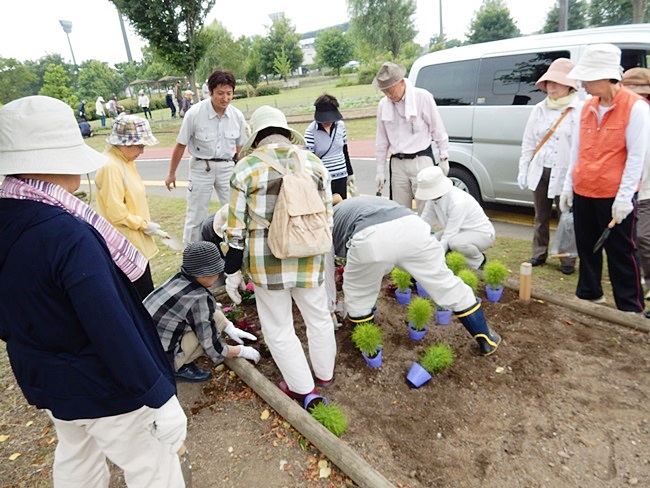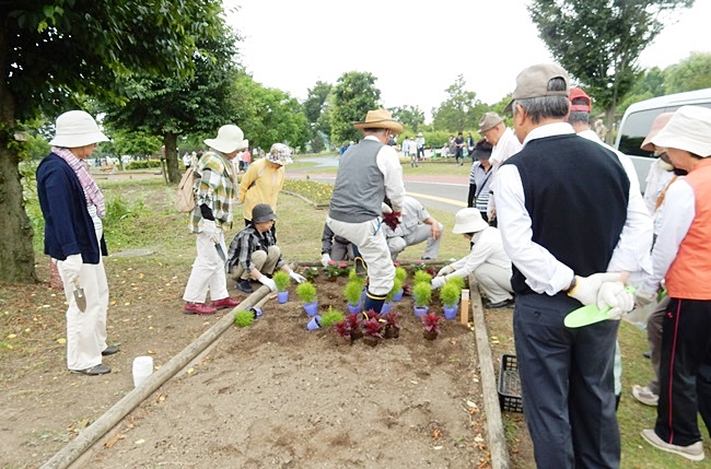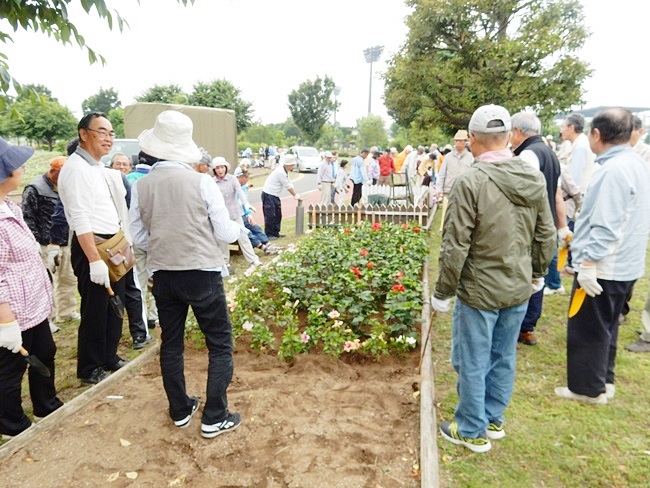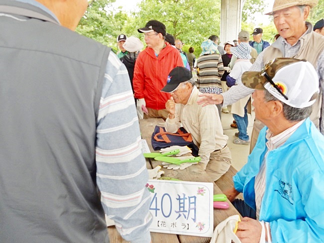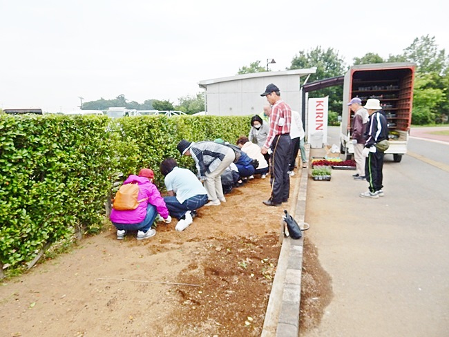 四阿に行くと、公園管理事務所の方々が、花の苗がいっぱい準備してありました。今回は花植えの作業のためか、253名の校友会員が参加して大賑わいです。