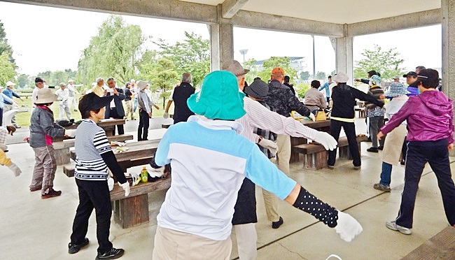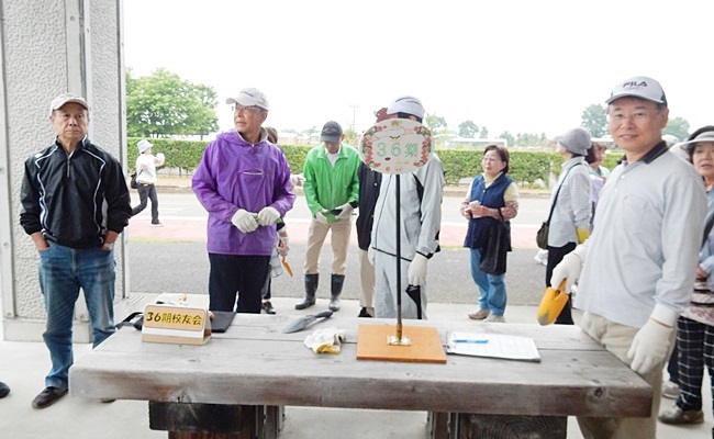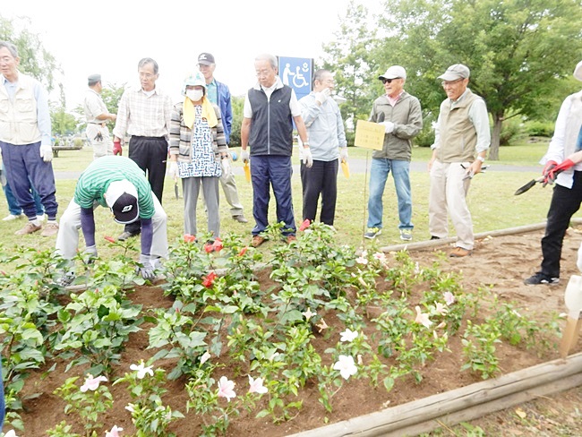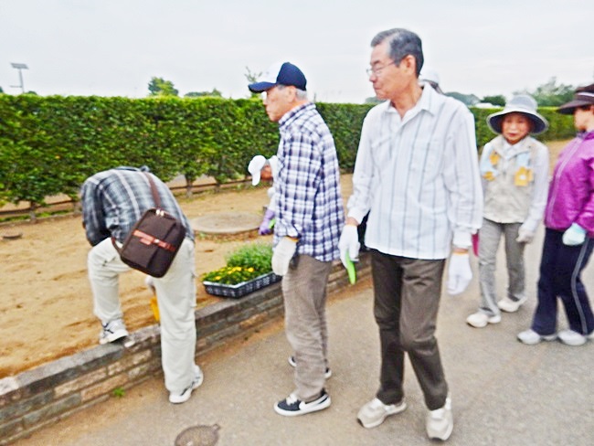 続いてラジオ体操です。ラジオ体操後 酒井副会長から花壇の場所の変更があるとの話がありチョットと戸惑ってしまいましたが、各期散らばって花植え作業に入りました。