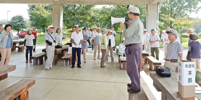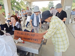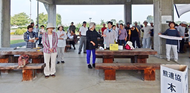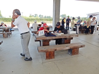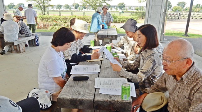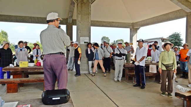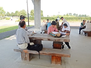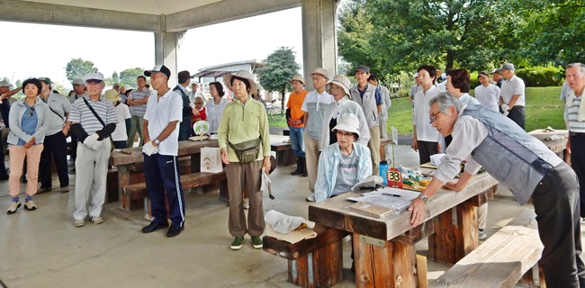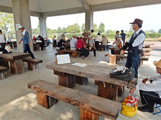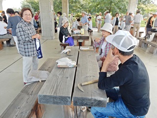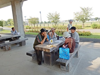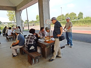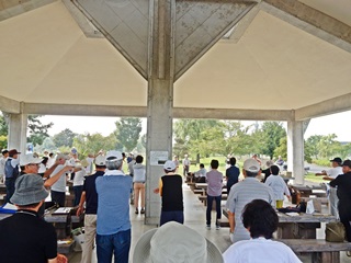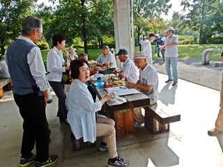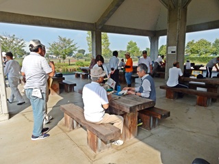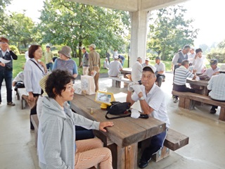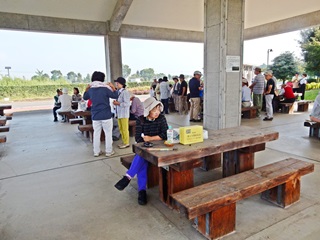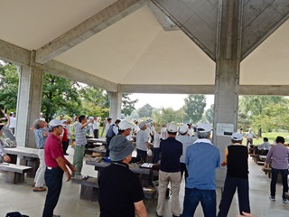 お彼岸も過ぎ、爽やかな秋風が心地よい日です。8時30分に到着すると、もう四阿の下のテーブル【4列の4列】のテーブル確保に半分が埋まっていました。9時には148名の皆さんが集まって頂きました。 四阿のテーブルでの団らん模様をご覧いただきます。