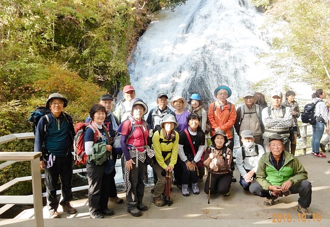 またまた集合写真を1枚。滝の脇を少し上ると湯滝上です。
