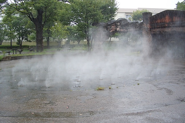 縄文の広場には、直径約5メートルの円形の噴水の様な、生暖かい蒸気が出ている、貝塚の雰囲気を醸し出す景観施設?がありました。(帰宅後に調べたら「約30分毎に霧を発生させ、時間を超越した幻想的な空間を演出しています。」とのことでした。)