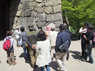 上田城の桜はすでに散り始めていましたが、遅咲きの桜や野草の花に信州の春を感じられ心地の良い見学でした。見学のあと大手門で記念写真撮影です、武士の衣装を着たボランテアの人たちと記念写真でした。