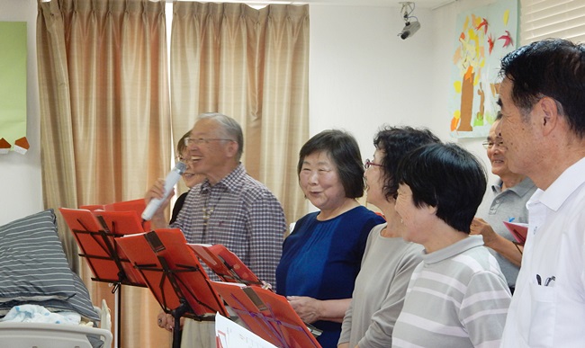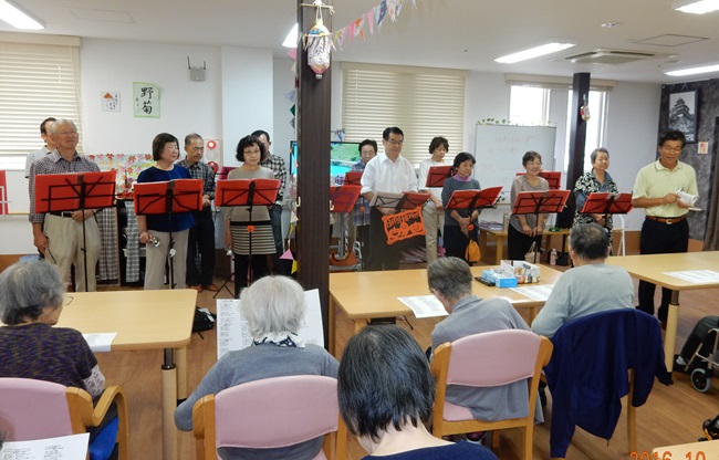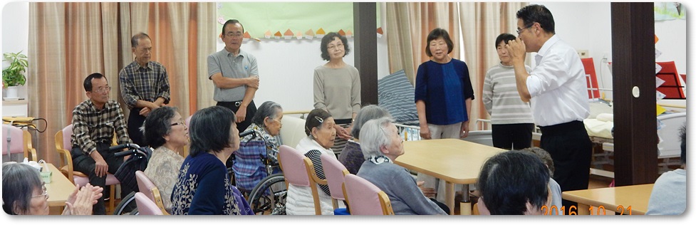 施設利用者のお年寄り20数名が待ちわびて、我々を歓待してくれている姿を拝見した時に気持ちも若干和らぎ、むしろ社会貢献の一歩をまた進むことの誇りじみた顔つきになっていたようでした。