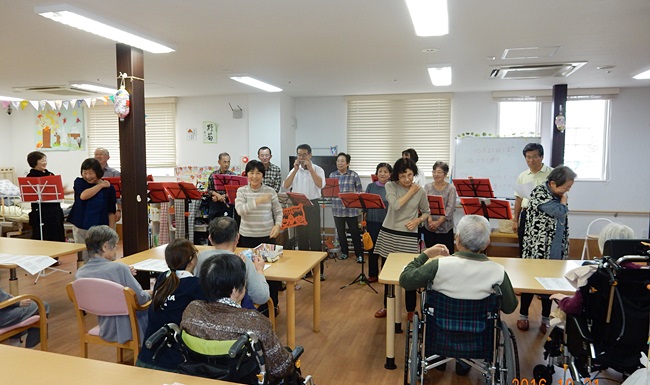 演奏の曲は親しみのある童謡唱歌と演歌の2曲などの、皆さんと一緒に歌いながら楽しめる10曲ほど用意をし、進めました。序盤は演奏と歌声のコミュニケーションはうまくいきませんでしたが、徐々に大きな声が響きわたり、会場の大きな歌声と演奏する私たちのハーモニカの声がしっかりとコラボをし、一体となることができました。