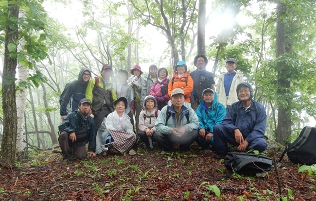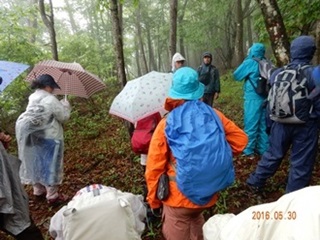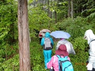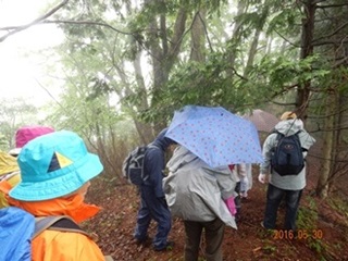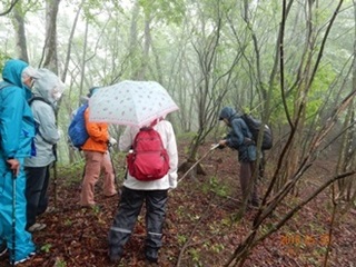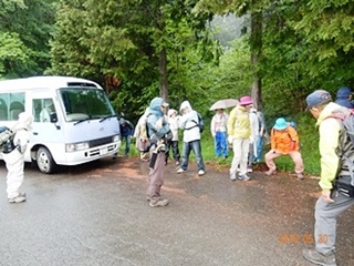 今回のコースは桧沢峠から日陰山(1409ḿ)へ、それから尾根伝いを歩いて降りてくるというものでした。マイクロバスで登山口まで送って頂き、雨模様の装備に着替え、先ずは準備運動から体を慣らし出発しました。