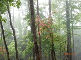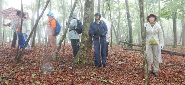 眺望が良い場所から、霧で何も見えなかったことは残念でしたが、雨でややもやっている神秘的な森林、山ツツジの花から落ちる水滴等晴れ間の時と全く違う森林の様態を体験する事ができました。