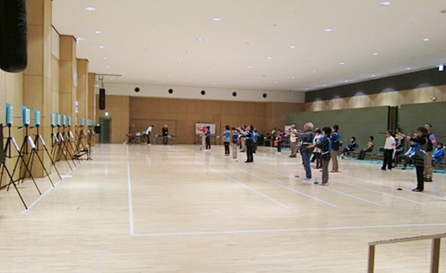 競技は、個人戦と団体戦を実施し、個人戦は、初段までは7m、2段以上は9m先の的に的中させる競技で、団体戦は、5人1チームで競いました。
