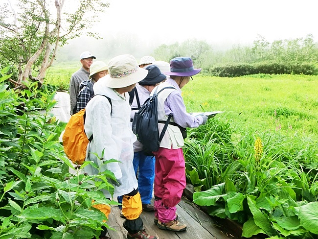 15年前は参加者21人で白馬大雪渓が望める展望湿原まで行ったが、今回は9人(前回も参加したのは5人)で手前の浮島湿原で引き返す。
