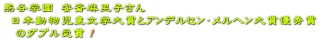 熊谷学園の安斎麻里子さんが第33回アンデルセン・メルヘン大賞の優秀賞と第28回日本動物児童文学大賞をダブル受賞しました。おめでとうございます。