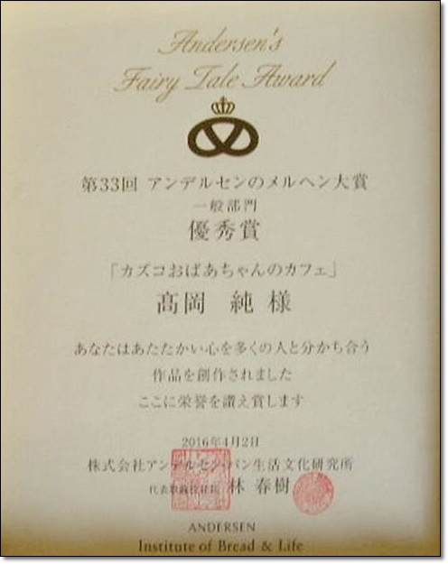 *アンデルセン・メルヘン大賞優秀賞 『カズコおばあちゃんのカフェ』 ペンネーム 高岡 純