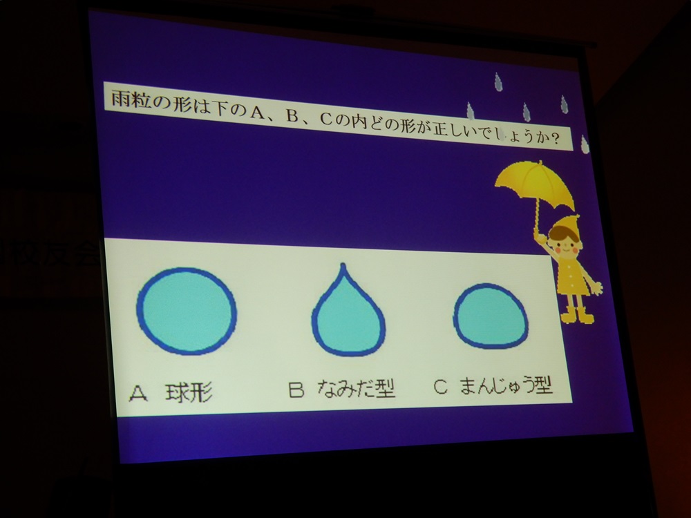 問題1番 雨粒の形はA・B・Cの内どの形が正しいでしょうか? 答えはA