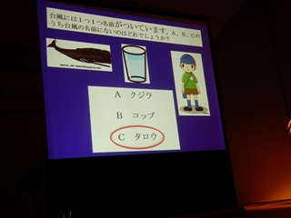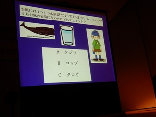 問題3番 台風には1つ1つ名前がついています。A・B・Cのうち台風にないのはどれですか?