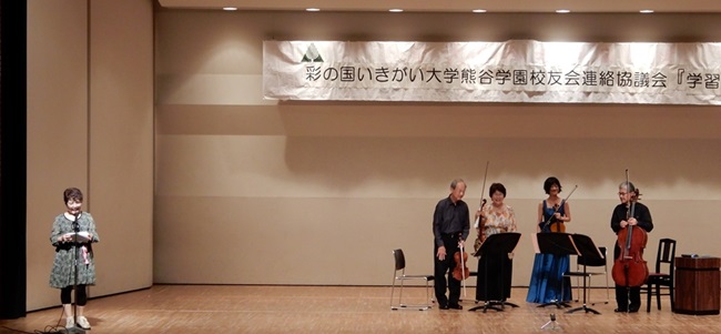昨年は妻沼中央公民館で開催しましたが、今回は熊谷市立文化センターの耐震工事が完了し、お借りする事ができました。又校友会員の方々の「講演とさくら弦楽四重奏団」も仲間の共演です。我が熊連協は〝永遠に不滅です〟