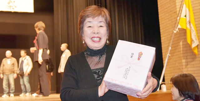毎年恒例の抽選会の始まりです。最高齢者表彰の27期中村勝年さんと24期市川マツエさん86歳の御利益にあやかるようにくじを引いて頂きました。