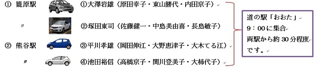 各々の車に分乗し、9:00道の駅「おおた」に集合、先ずは今日の参加者確認 16名(男性5名・女性11名)でしたが、当日都合が出来て1名が不参加になってしまいました。
