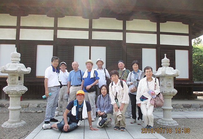 途中で熱中症事故などは避けたいと自由参加にし、半数の11名が給水・暑さ対策の上で一路「縁切寺満徳寺」へと歩き始めました。