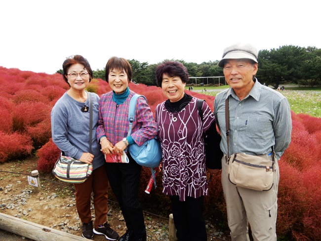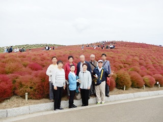 7時15分熊谷市文化センター前に集合、深谷観光バス、大型バスと中型バスの2台にて出発。羽生IC~羽生PA~笠間PA~ひたち海浜公園IC~10時15分に国営ひたち海浜公園西口へ到着、約3時間のバス移動です。西口より徒歩にて「コキア群生地」まで約20分程歩いて、バス1号車、2号車別に集合写真を撮りました。