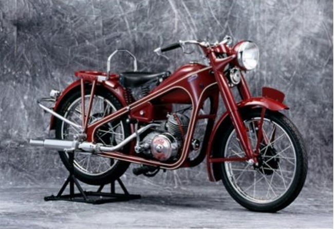 先ずは、3階の2輪レース車ブースでは、日本で初めて発売された原動機付自転車です。昭和21年(1946年)、本田宗一郎が陸軍で使用していた無線用小型エンジンを改良し自転車に取り付け試走したのが、浜松のオートバイ製造の始まりでした。昭和23年にホンダ初の2輪車「ドリームD型」が作られました。