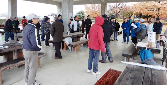 本日は中島会長のご挨拶から始まりました。皆さん本日はこの雨、もう暫らくすれば雨も上がり晴れ間が見えると思いますが、 今日は落葉拾い、ほうきで集めるのは無理と判断しました。沢山の仲間がお集まり頂きましたが、こういうチャンスを上手く利用して校友を深めてください。