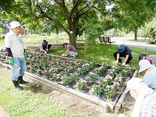会長のあいさつから始まり、新役員の紹介(佐藤広報部長)のご挨拶を頂き、公園管理事務所から今年度は花壇に「防草シート」を張り巡らしました、前回、花を植えて頂きましたが防草シートを張ったため、雑草は少ないため花壇の周辺の除草をお願いします。
