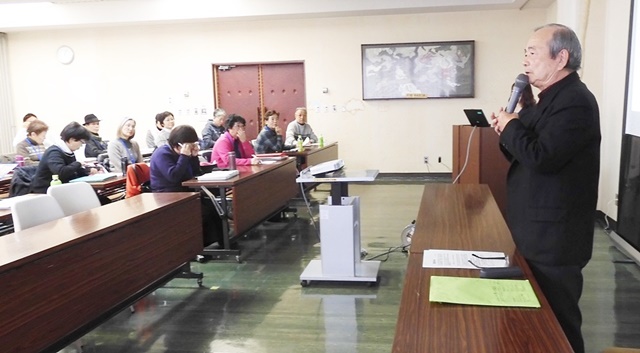 パワーポイントを使い、事務局の応援を頂き、スライドに映し出し、熊連協専攻4期(金)校友会長が1年間の経験をもとにお話をして頂きました。