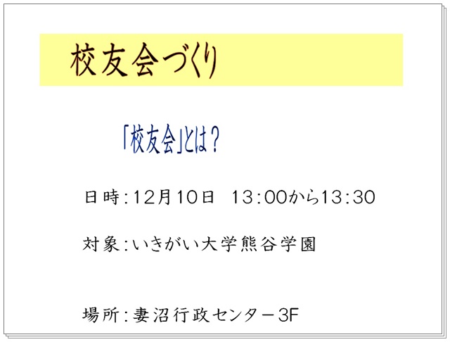 令和元年12月10日(火)午後1時から30分間の、現役生に「いきがい大学熊谷学園44期生」への卒業後の校友会づくりについての説明会の時間をつくって頂きました。