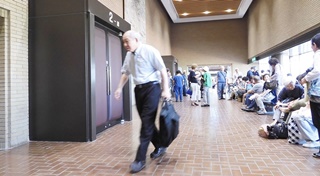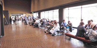 開館前30分ですが、ロビーには大勢の会員さんが輪になり談笑が始まっております。時間にならないと開場のドアは開けて頂けないのは承知ですが、なにせこの人数です。