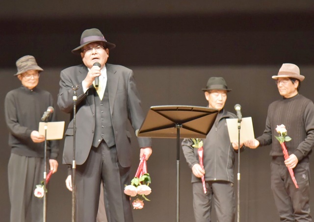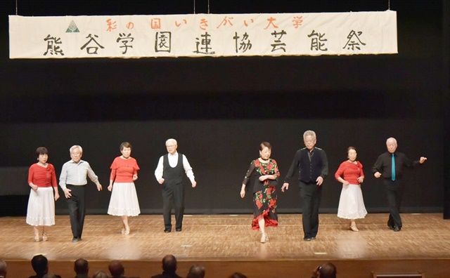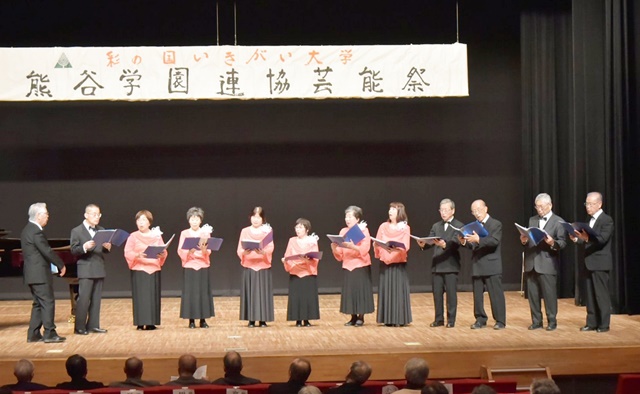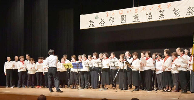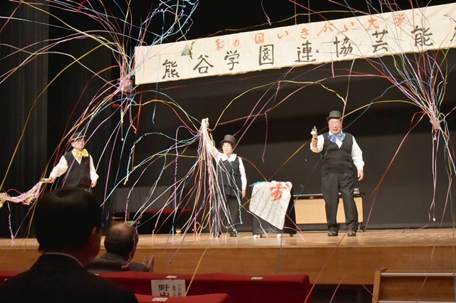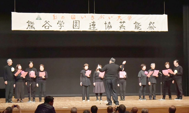 来賓挨拶は、熊谷市長 富岡清様、(公財)彩の国いきいき埼玉理事長 永沢映様代理で彩の国いきがい大学熊谷学園野中明彦所長様、根岸県連協会長様から頂きました。