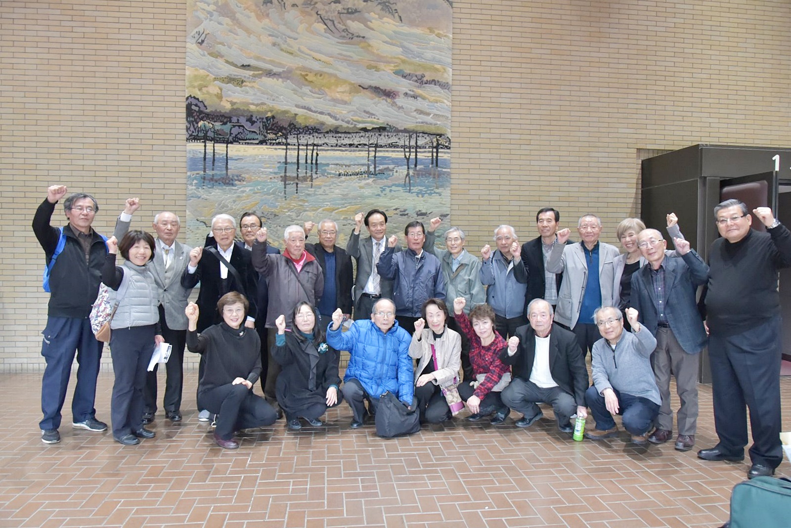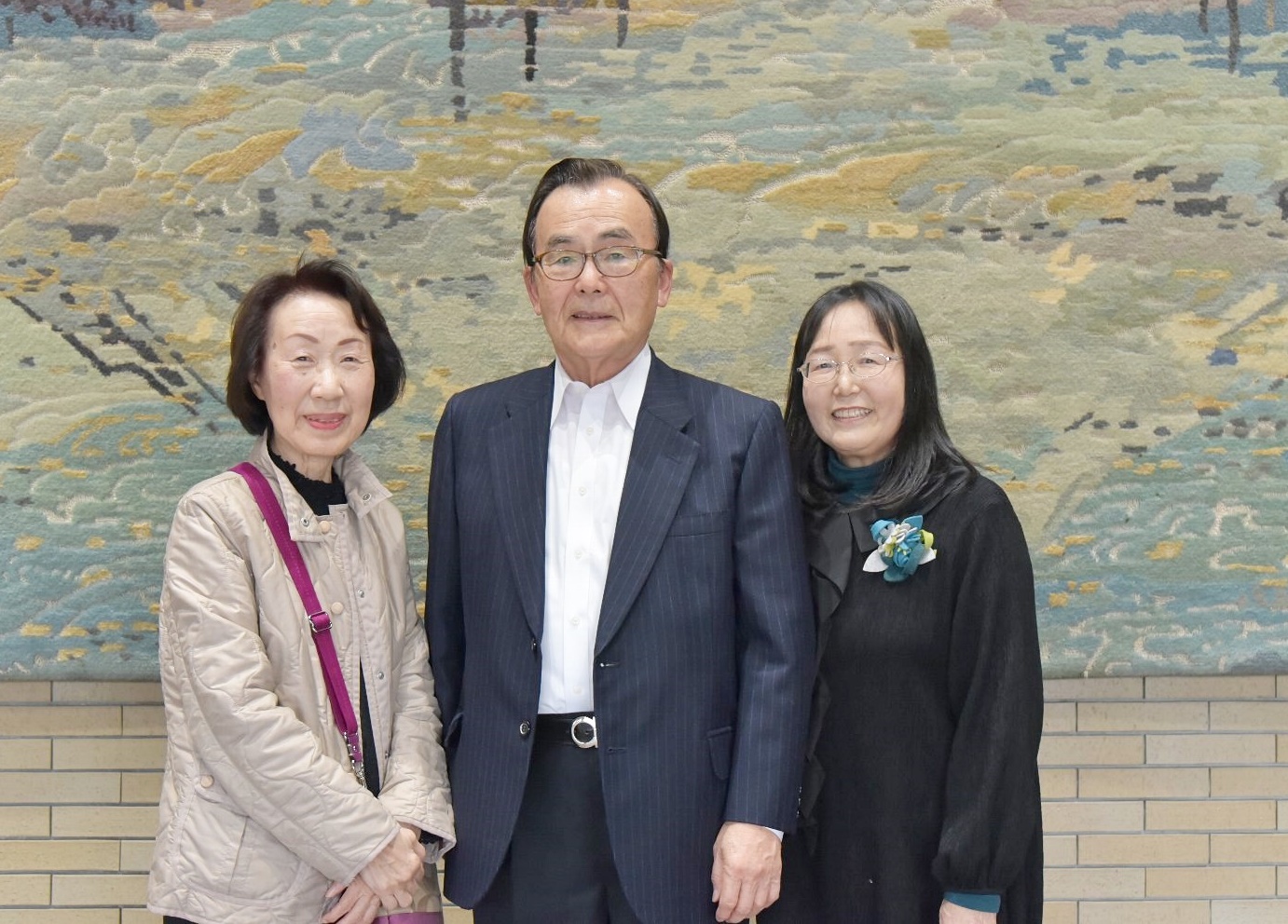 (開演前に案内板の前で、中島会長、佐藤広報部長とご来賓の皆様の記念写真)