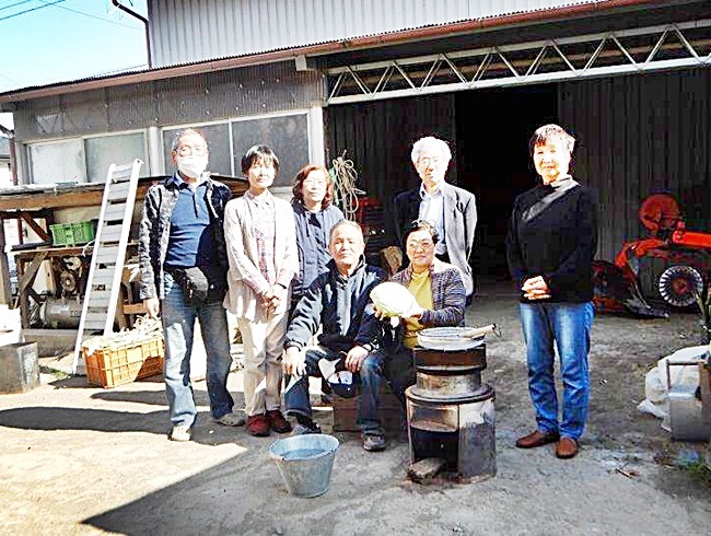 12:40ピか家に到着し、庭にはカマドが置いてあり薪がもうもうと燃えています。女性軍はネギ・キャベツ・食卓の準備、男性軍はうどんを茹でての役割分担です。