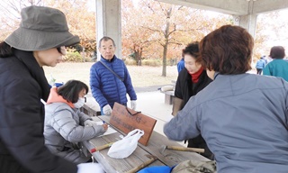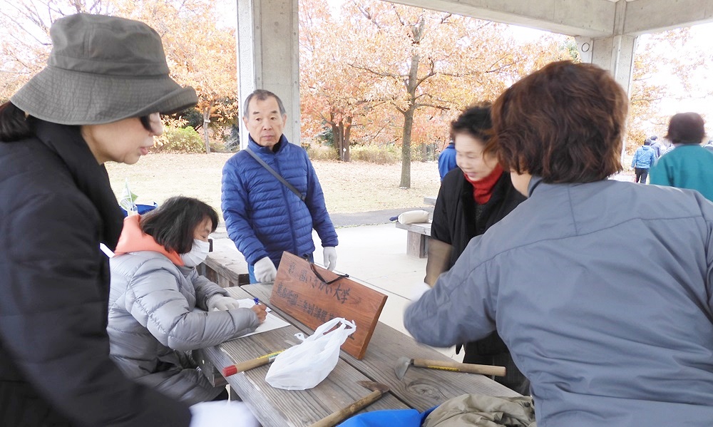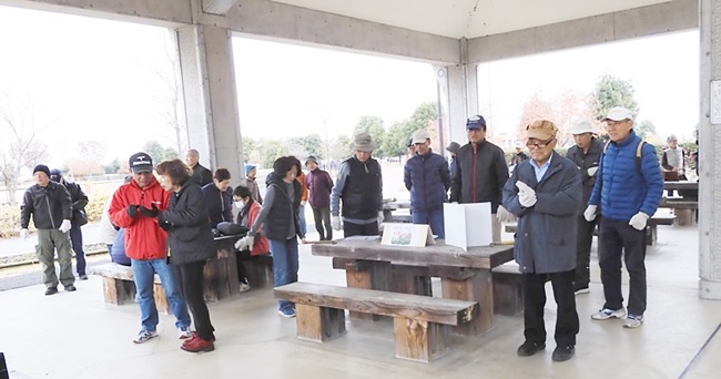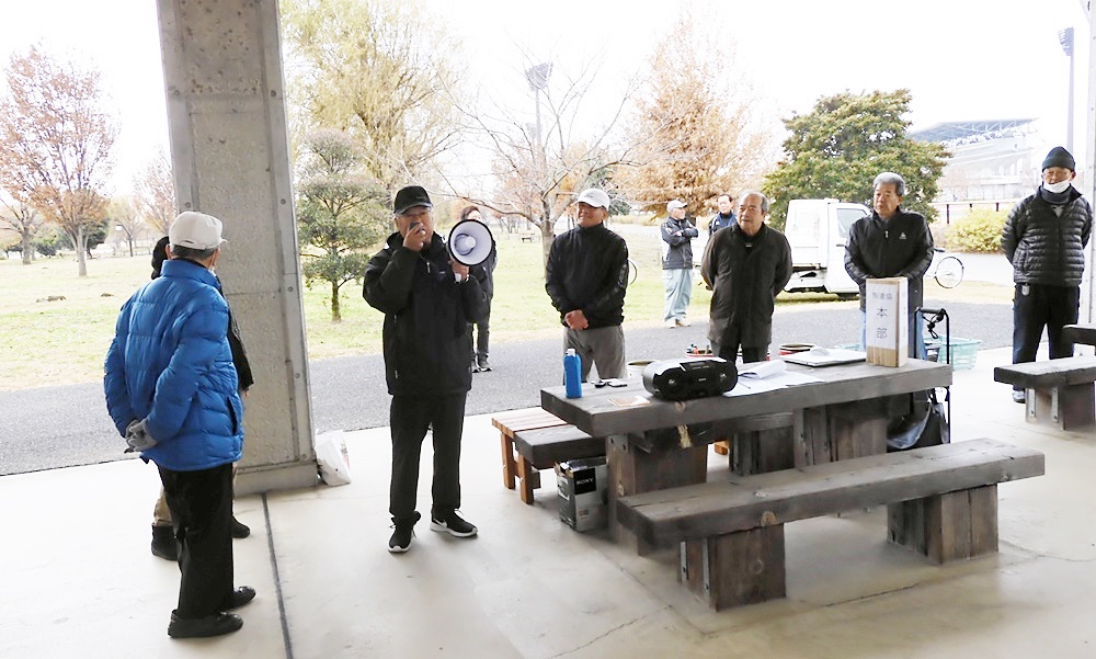 12月11日(水曜日)第13回目の花ボラに参加してきました。今日は最高の冷え込みです。8時現在7℃曇り日です。チョット時間に遅れ8時50分に着きました。四阿の模様です。(皆さんほおっかぶり)