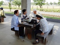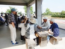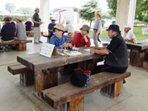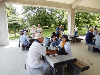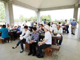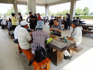 8:30分にはほとんどの方が集まり各テーブルには談笑の花盛りです。四阿の様子をご覧ください。