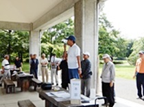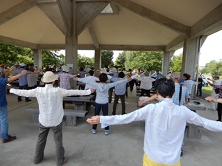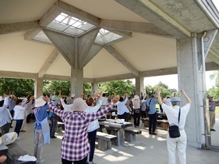 ラジオ体操が始まりました。四阿の周りの日陰での場所を選んで心地よい空気をいっぱい吸って気持ちよさそうです。今日の指導は35期 櫻沢さんです。
