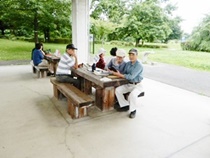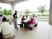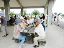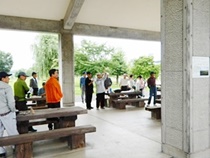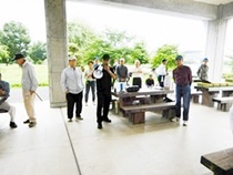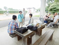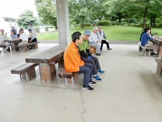 8:30分にはほとんどの方が集まり 各テーブルには談笑の花盛りです。四阿の様子をご覧ください。