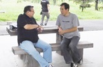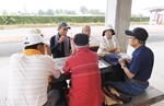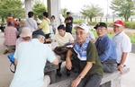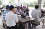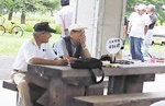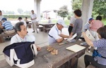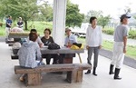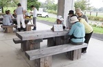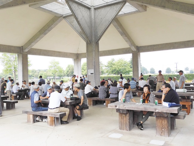 8:30分、雨上がりで、涼しくなったお蔭で集まりが早かなった。お集まりの各テーブルには談笑の花盛りです。四阿の様子をご覧ください。