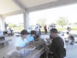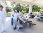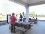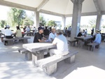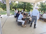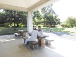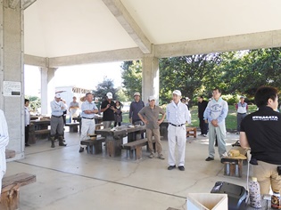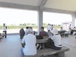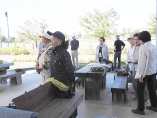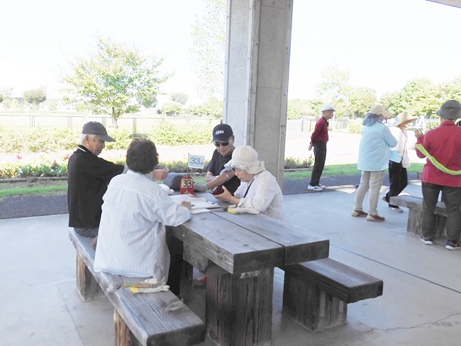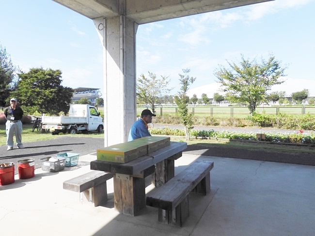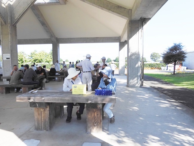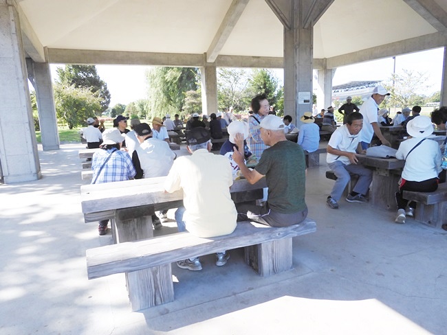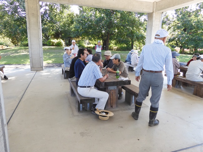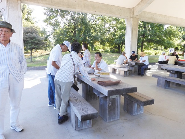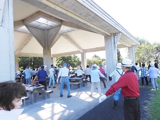 今日は9:00の気温が25℃。最高の快晴で気分爽快、まだまだ危険な気候ですが無理は禁物、お集まりの各テーブルには談笑の花盛りです。四阿の様子をご覧ください。