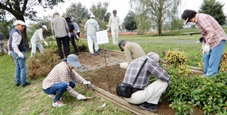 社会参加活動として、最初に挙げられるのは熊谷スポーツ文化公園花壇管理ボランティア(花ボラ)です。毎月2回第2・第4水曜日、早朝1時間半実施していますが、毎回150名以上が参加し、各校友会の交歓会の様相を呈しています。