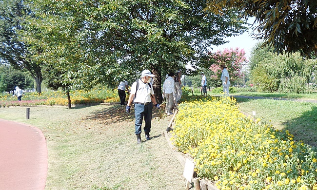 今回の除草作業では、梅雨の長雨で花壇の花が根腐れを起こし枯れた花のかたずけを行いました。
