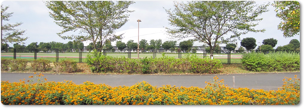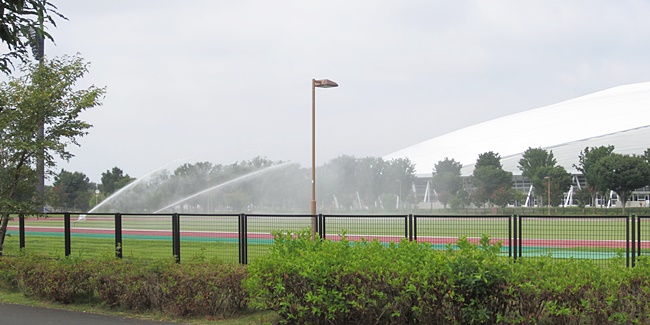 隣の陸上グラウンドを見ると、芝生に散水中です。芝生と同様、私にもシャワーを掛けてほしいところです。