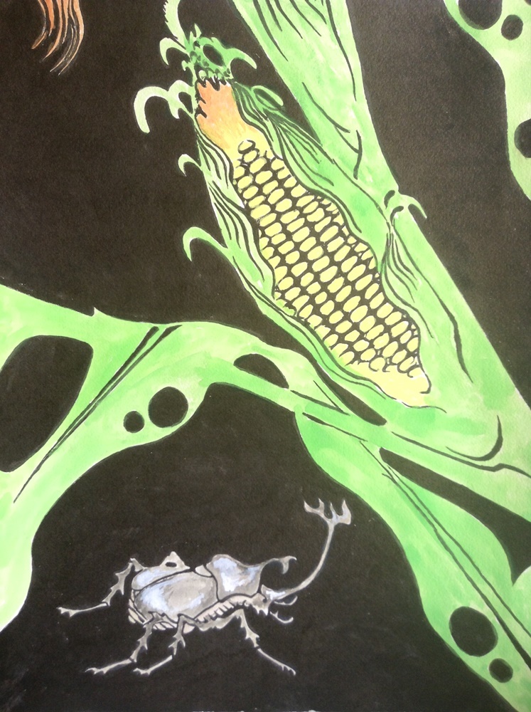・トウモロコシ畑にカブトムシが飛んで一休みです。