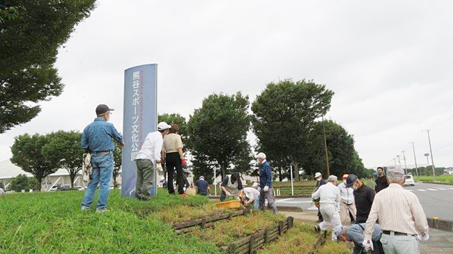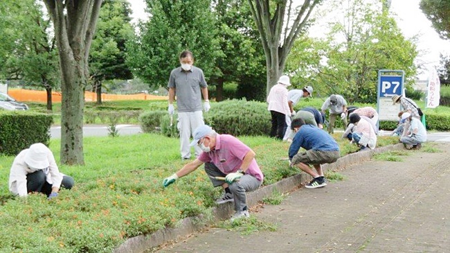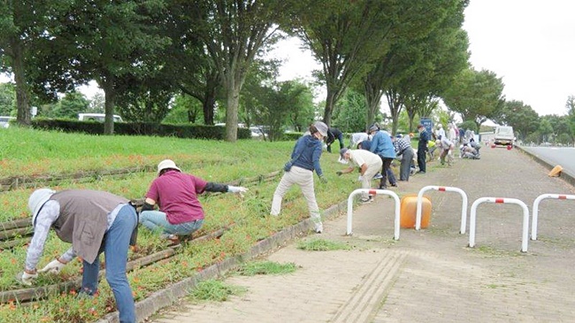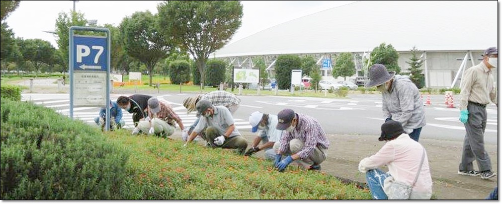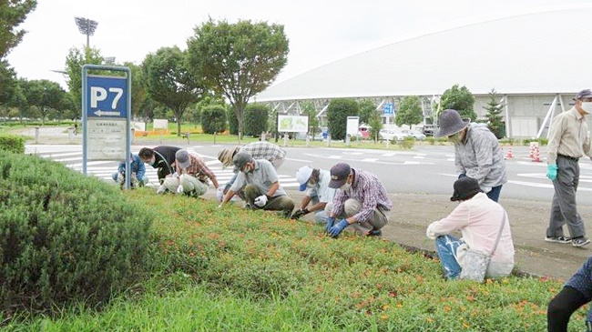 会長の挨拶の後、管理事務所の加藤課長さんより本日の手順を話しました。8月の長雨又天候が荒れた事により従来の花ボラを実施した花壇の花が無駄になり、車の進入入口付近の花壇を整備する事になりました。