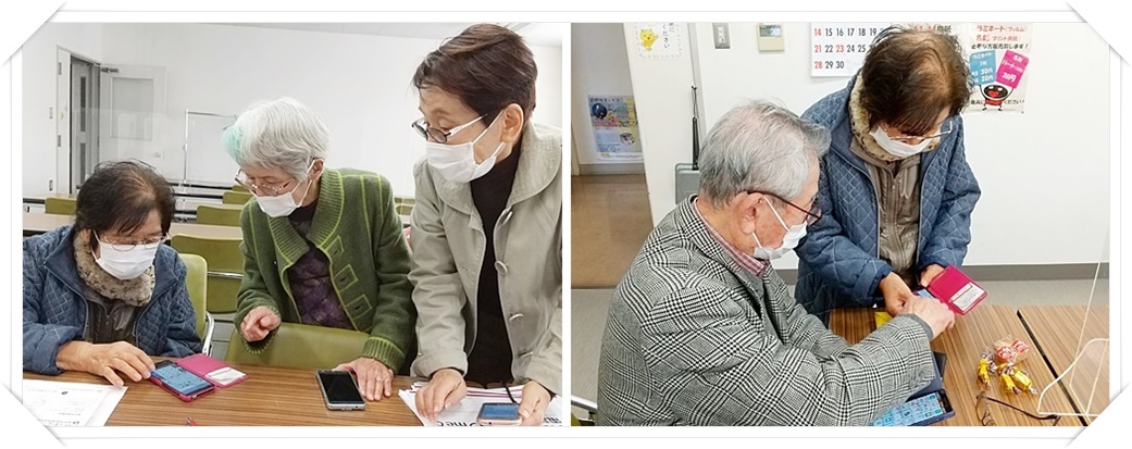 さらに最近スマホを始めた会員がいるので、コロナが下火にな た11月25日、次のステップとして、実際に会員が集まって使い方や困り事を知っている人が教え合い、便利な機能や楽しい使い方等を紹介したり自慢の写真を見せ合ったりなどして、疲れたら“おしゃべりタイム”の「スマホ教室」を熊谷市市民活動支援センターで開講しました。