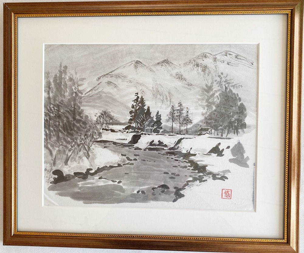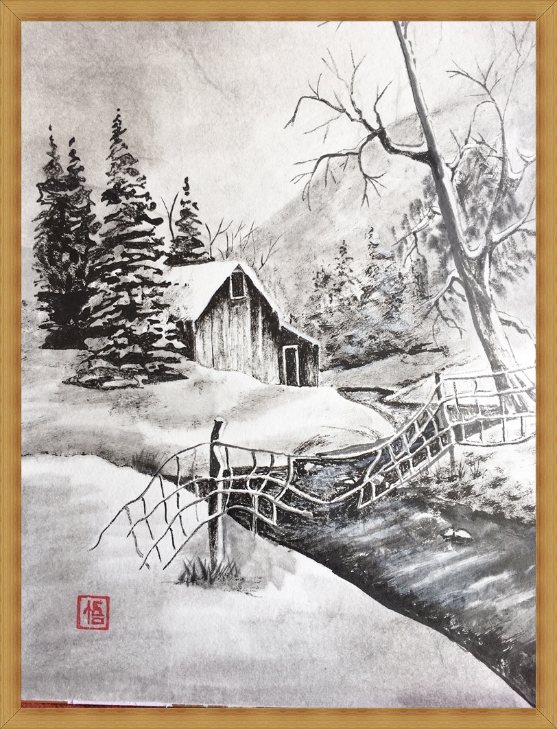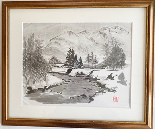 今回は、全て水墨画になりますが、水墨画で描く風景画は墨だけの絵ですが濃淡やボカシ等によりまるで色が着いているかのように感じます。