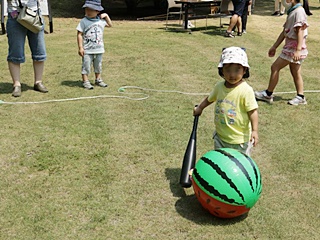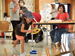 今回用意した昔遊びは、輪なげ・竹馬・水鉄砲・けん玉・お手玉・フラフープ・スイカ割りを用意しました。昔から親しまれている遊びは、遊び方やル-ルが極めてシンプルです。お父さんもお母さんも最初は遠くから見ているだけでしたが一声かけると、子供と一緒に真剣な眼差しで楽しんおりました。また新しい遊 びとしてボッチャとストラックアウトを用意し大変好評をいただきました。