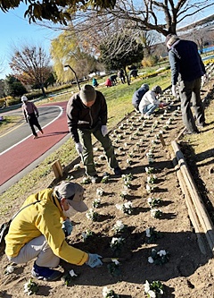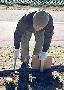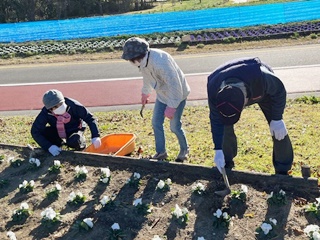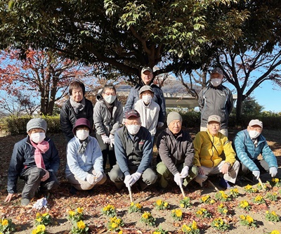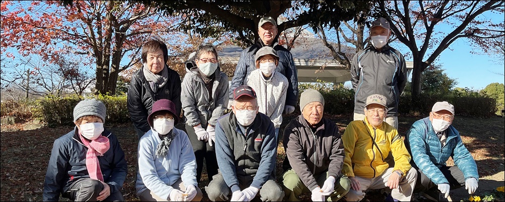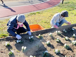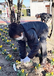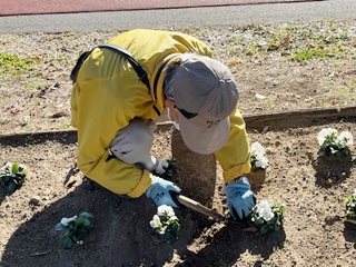 担当の花壇は落ち葉で埋め尽くされていましたが、パンジーはしっかりと可愛い花を咲かせていました。落ち葉は取り除かなくてよいとのことで、他の花壇の除草をいたしました。